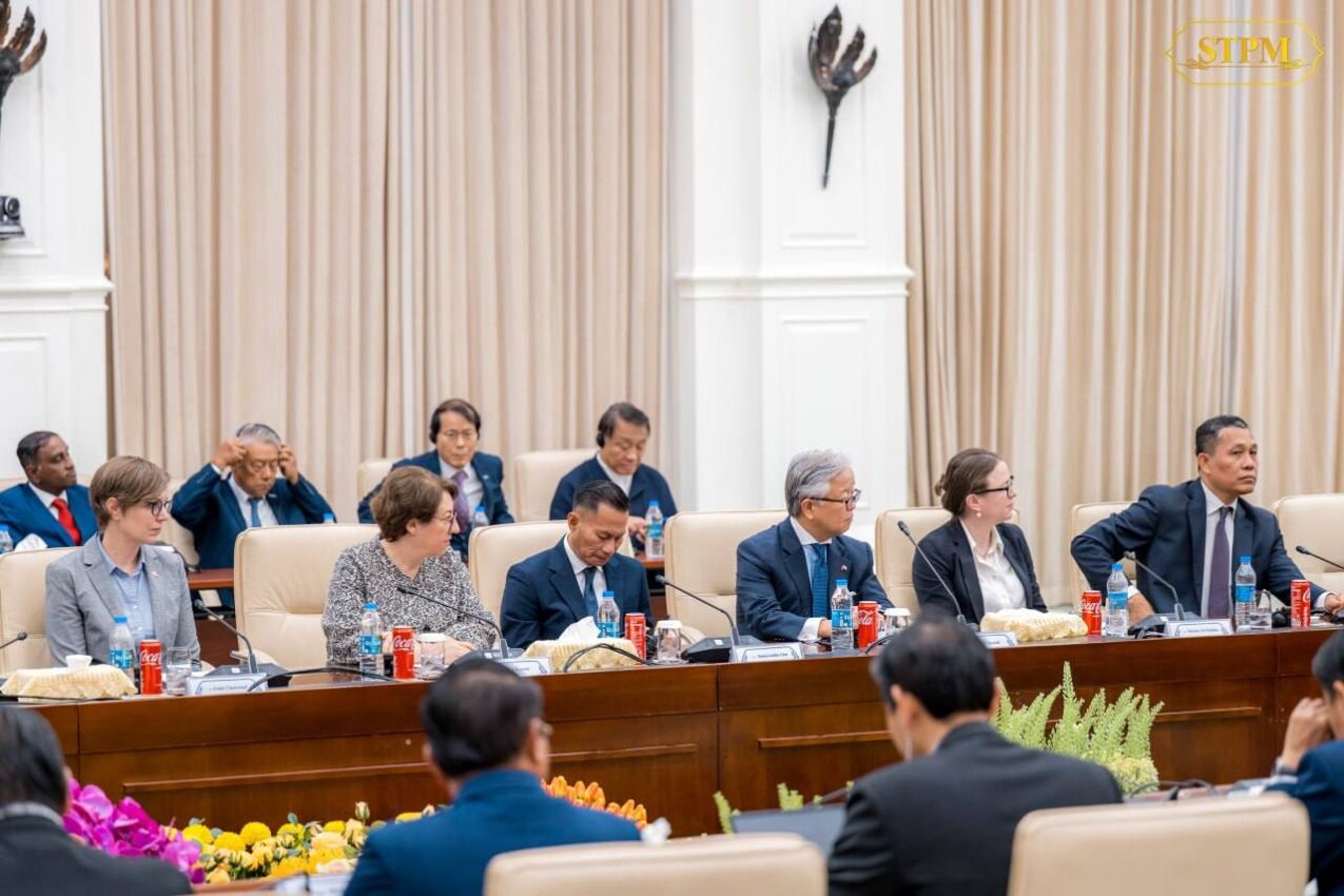 នៅព្រឹកថ្ងៃអង្គារ ទី៨ ខែមេសា ឆ្នាំ២០២៥ សម្តេចធិបតី ហ៊ុន ម៉ាណែត នាយករដ្ឋមន្ត្រីនៃកម្ពុជា ទទួលជួបជាមួយបណ្ដាមិត្តជាដៃគូអភិវឌ្ឍន៍ និងវិស័យឯកជន ដែលគាំទ្ររាជរដ្ឋាភិបាលលើសម្មភាពមីននៅកម្ពុជា នៅវិមានសន្តិភាព។