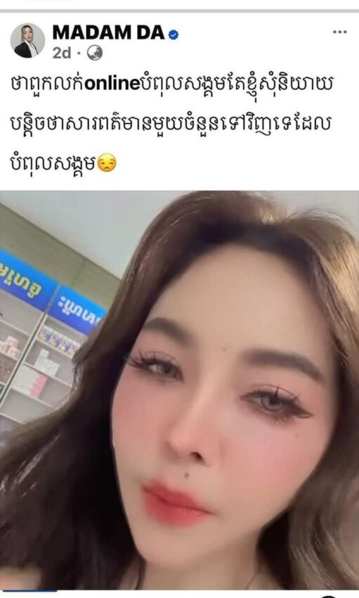 លោក ទេស វិបុល ប្រធានសមាគមសេរីភាពអ្នកសារព័ត៌មានកម្ពុជា នៅថ្ងៃទី២៤ ខែមេសានេះ បានធ្វើលិខិតមួយច្បាប់ ដាក់ជូនឯកឧត្តម នេត្រ ភក្ត្រា រដ្ឋមន្ត្រីក្រសួងព័ត៌មាន ដើម្បីឱ្យក្រសួងពិនិត្យ និងចាត់វិធានការលើស្ត្រីអ្នកលក់ទំនិញអនឡាញម្នាក់ដែលបានប្រើហ្វេសប៊ុកផេកឈ្មោះ MADAM DA (ម៉ាដាមដា) ផ្សាយផ្ទាល់ និងបង្ហោះវីដេអូ ប្រមាថមើលងាយអ្នកសារព័ត៌មានថា ជាអ្នកបំពុលសង្គមចំនួន៨០ភាគរយ។