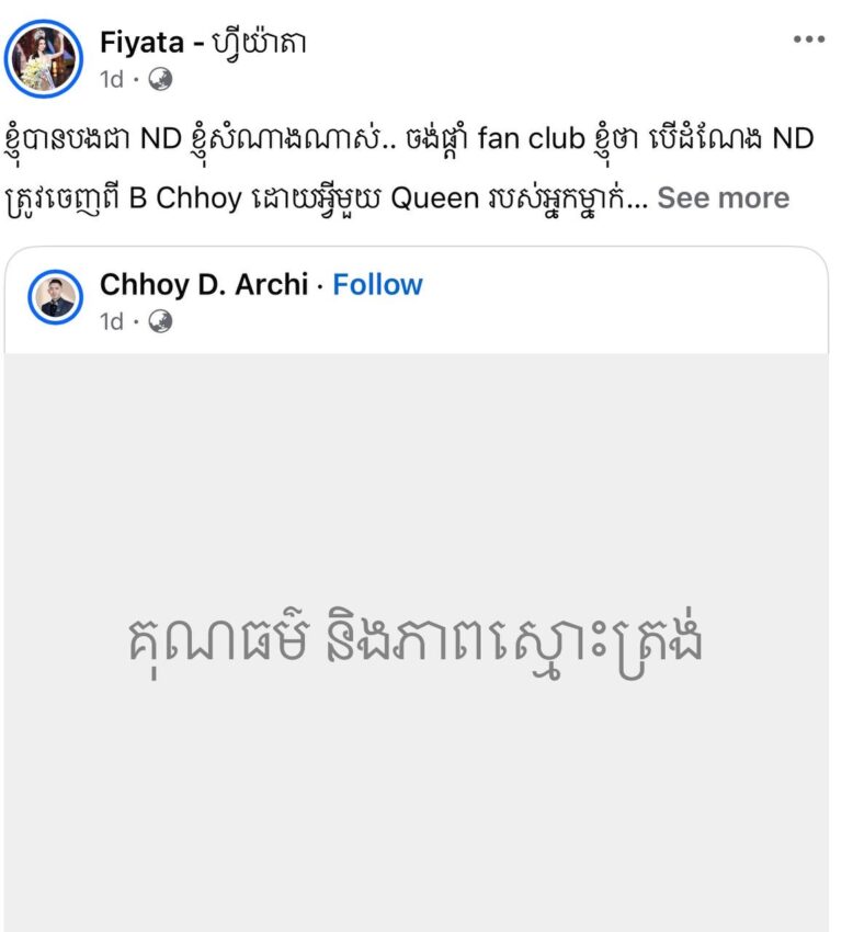 ក្រោយពី ND កម្មវិធី Miss Universe Cambodia បង្ហោះសារថា « គុណធម៌ និងភាពស្មោះត្រង់ » បានធ្វើឱ្យមានការរង្គោះរង្គើរយ៉ាងខ្លាំងក្នុងវិស័យបវរកញ្ញា រហូត ហ្វីយ៉ាតា ដែលជាម្ចាស់មកុដ Miss Universe Cambodia 2025 ទ្រាំមិនបានក៏បានបង្ហើវអារម្មណ័ថា « ខ្ញុំបានបងជា ND ខ្ញុំសំណាងណាស់ ចង់ផ្តាំ Fan Club ខ្ញុំថា បើតំណែង ND ត្រូវចេញពី B Chhoy ដោយអ្វីមួយ Queen របស់អ្នកម្នាក់នេះក៏ចេញដូចគ្នា ហើយបើគេមិនឈប់ចង់បំផ្លាញដំណើររបស់ពួកខ្ញុំ បើបែបនេះមែនបំណងនៃការតំណាងប្រទេស ក៏លែងមានដែរ » ។