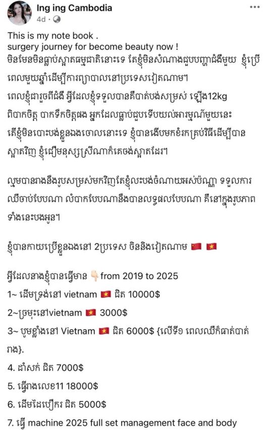 អ៊ីងអ៊ីង បានរៀបរាប់ថា « មិនមែនមិនធ្លាប់ស្អាតធម្មជាតិនោះទេ តែខ្ញុំមិនសំណាងជួបបញ្ហាជំងឺមួយ ខ្ញុំប្រើពេលមួយឆ្នាំដើម្បីព្យាបាលនៅប្រទេស វៀតណាម ។ ពេលខ្ញុំជារួចពីជំងឺ អ្វីដែលខ្ញុំទទួលបានគឺបាត់បង់សម្រស់ឡើង១២គីឡូក្រាម ពិបាកចិត្ត បាក់ទឹកចិត្តផងអ្នកដែលធ្លាប់ជួបទើបយប់អារម្មណ៍នេះ ។ តែខ្ញុំមិនបានបោះបង់ខ្លួនឯងចោលនោះទេ ខ្ញុំបានងើបមកខំរកគ្រប់វិធីដើម្បីបានស្អាតវិញ ខ្ញុំជឿមនុស្សស្រីណាក៏ចង់ស្អាតដែរ ។ ល្មមបានរាងនិងរូបសម្រស់មកវិញខ្ញុំលះបង់ចំណាយអស់ប៉ុណ្ណា ទទួលកាឈឺចាប់បែបណា លំបាកបែបណានឹងបានលទ្ធផលបែបណា គឺនៅក្នុងរូបភាពទាំងនេះបងប្អូន ។ នៅឆ្នាំ ២០២១៩ មកដល់ឆ្នាំ២០២៥ ខ្ញុំធ្លាប់ធ្វើដើមទ្រូង , កែច្រមុះ , បូមខ្លាញ់ , ដាំសក់ , ធ្វើរាងលេខ១១ , ដើមដៃ បឿករ , ធ្វើមុខ ចាក់សៀតផ្កា , ភ្នែក , មាត់ , ថ្ពាល់ និងធ្វើធ្មេញជាដើម… សរុបមកអស់ជិត១០ម៉ឺនដុល្លារ ។