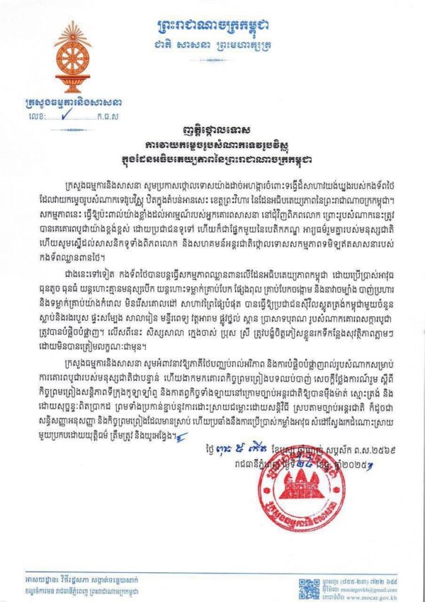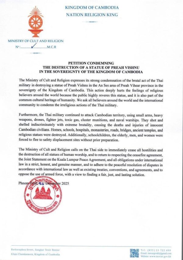 គួរបញ្ជាក់ផងដែរថា បន្ទាប់ពីកងទ័ព ថៃ បានឈ្លានពាននិងបានវាយកម្ទេចរូបសំណាក ទេវរូបវិស្ណុ ក្នុងដែនអធិបតេយ្យភាព កម្ពុជា បានធ្វើឱ្យពិភពលោកថ្កោលទោសជាខ្លាំង ជាកស្តែងក្រសួងធម្មការនិងសាសនា ស្នើ ដល់សាសនិកទូទាំងពិភពលោក និងសហគមន៍អន្តរជាតិថ្កោលទោសសកម្មភាពទមិឡឥតសាសនារបស់ កងទ័ពឈ្លានពាន ថៃ ដែលបានវាយកម្ទេចរូបសំណាកទេវរូបវិស្ណុ ក្នុងដែនអធិបតេយ្យភាព កម្ពុជា ។ ក្រសួងធម្មការនិងសាសនា ចេញ ញត្តិថ្កោលទោស ការវាយកម្ទេចរូបសំណាកទេវរូបវិស្ណុ ក្នុងដែនអធិបតេយ្យភាពនៃព្រះរាជាណាចក្រកម្ពុជា ៕