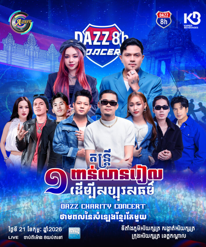 កំពូលតារាចម្រៀងជាច្រើនរូបត្រៀមនឹងទៅអង្រួនឆាក DAZZ CHARITY CONCERT ឱ្យផ្ទុះកក្រើកឡើងតែម្តងមុនដាច់ខែកុម្ភះនេះ ជាក់ស្តែងនៅថ្ងៃទី ២១ ខែ កុម្ភៈ ឆ្នាំ ២០២៦ ជួបជាមួយកំពូលតារាចម្រៀង ឧកញ៉ា ខេមរៈ សិរីមន្ត , កញ្ញា តន់ ចន្ទសីម៉ា ព្រមទាំងតារាចម្រៀងវ័យក្មេងសម្លេងពិរោះជាច្រើនរូបទៀត ។ ដោយឡែកនៅថ្ងៃទី២២ ខែកុម្ភៈ ឆ្នាំ២០២៦ ជួបជាមួយកំពូលតារាចម្រៀង លោក ព្រាប សុវត្ថិ , លោកខេម , លោក សុវត្ថិ មុនីវណ្ណ និង លោក សុវត្ថិ សិរីវុឌ្ឍ ព្រមទាំងតារាចម្រៀងវ័យក្មេងសម្លេងពីរោះព្រមទាំងមានរូបសម្រស់ស្រស់ស្អាត និងរស់រាយរាក់ទាក់ផងដែរ ។