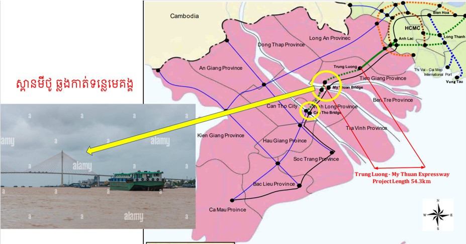 បច្ចុប្បន្ននៅតែជាបញ្ហាសម្រាប់កម្ពុជា ដោយសារត្រូវតែផ្ទេរទំនិញនៅកំពង់ផែហូជីមិញ មុននឹងដឹកចូលមកកំពង់ផែភ្នំពេញ ព្រោះវៀតណាមបានសាងសង់ស្ពានមីថូ (មើលក្នុងផែនទី)ឆ្លងកាត់ទន្លេមេគង្គ។ ស្ពាននេះបង្កឧបសគ្គដល់កំពង់ផែភ្នំពេញត្រង់ថា នៅរដូវទឹកស្រកនាវាខ្នាតធំអន្តរជាតិចូលមកកំពង់ផែភ្នំពេញអត់រួចដោយសារទឹកទន្លេរាក់ពេក។ នៅពេលរដូវទឹកឡើងទឹកមានជម្រៅជ្រៅ តែនាវានៅតែមិនអាចចូលមកកំពង់ផែភ្នំពេញបាន ដោយសារនាវាខ្នាតអន្តរជាតិខ្ពស់ជាងស្ពានមីថូ ។