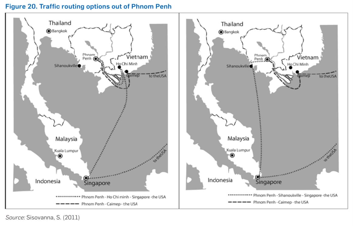 ដូច្នេះទំនិញរបស់កម្ពុជា ត្រូវតែផ្ទេរមកនាវាខ្នាតតូចៗដើម្បីឆ្លងកាត់មកកំពង់ផែភ្នំពេញ។ នេះជាបញ្ហា ដែលត្រូវចំណាយថ្លៃដឹកជញ្ជូនផង ថ្លៃស្តុកទុកផង ថ្លៃលើកដាក់ផង និងនីតិវិធីយូរផង ធ្វើឱ្យផលិតផលរបស់កម្ពុជា មានតម្លៃខ្ពស់ ពិបាកប្រកួតប្រជែងនៅទីផ្សារអន្តរជាតិ។