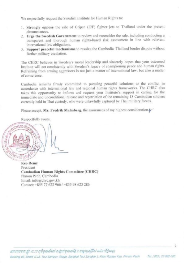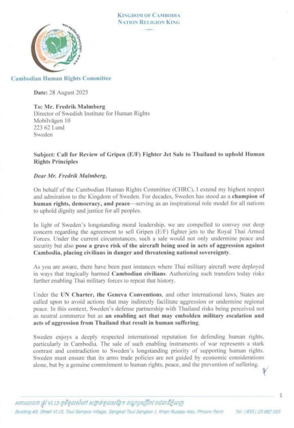 គណៈកម្មាធិការសទ្ធិមនុស្សកម្ពុជា ស្នើដល់វិទ្យាស្ថានសិទ្ធិមនុស្សស៊ុយអ៊ែត ឱ្យពិនិត្យមើលឡើងវិញអំពីកិច្ចព្រមព្រៀងលក់យន្ដហោះចម្បាំង Gripen ដល់ប្រទេសថៃ។ សំណើនេះធ្វើឡើងដោយគណៈកម្មាធិការសទ្ធិមនុស្សកម្ពុជា ធ្លាប់បានកត់សម្គាល់ឃើញថា ស៊ុយអ៊ែត ជាប្រទេសមួយ ក្នុងចំណោមប្រទេសដែលតែងតែយកចិត្តទុកដាក់ខ្ពស់ និងជាគម្រូផ្នែកសិទ្ធិមនុស្ស និងសន្ដិភាពក្នុងពិភពលោក។