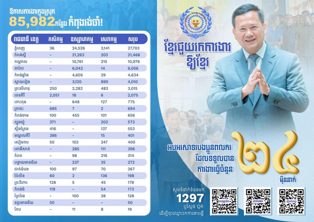តាមរយៈបណ្តាញសង្គមផ្លូវការ សម្តេចបវរធិបតី បានបញ្ជាក់ថា ឱកាសការងារចំនួន ៨៥,៩៨២ កន្លែង នៅទូទាំងរាជធានី-ខេត្ត ទាំង២៥ កំពុងរង់ចាំបងប្អូនប្រជាពលរដ្ឋដែលកំពុងស្វែងរកការងារធ្វើ ជាពិសេសបងប្អូនប្រជាពលរដ្ឋដែលបានវិលត្រឡប់មកប្រទេសកម្ពុជាវិញ ។