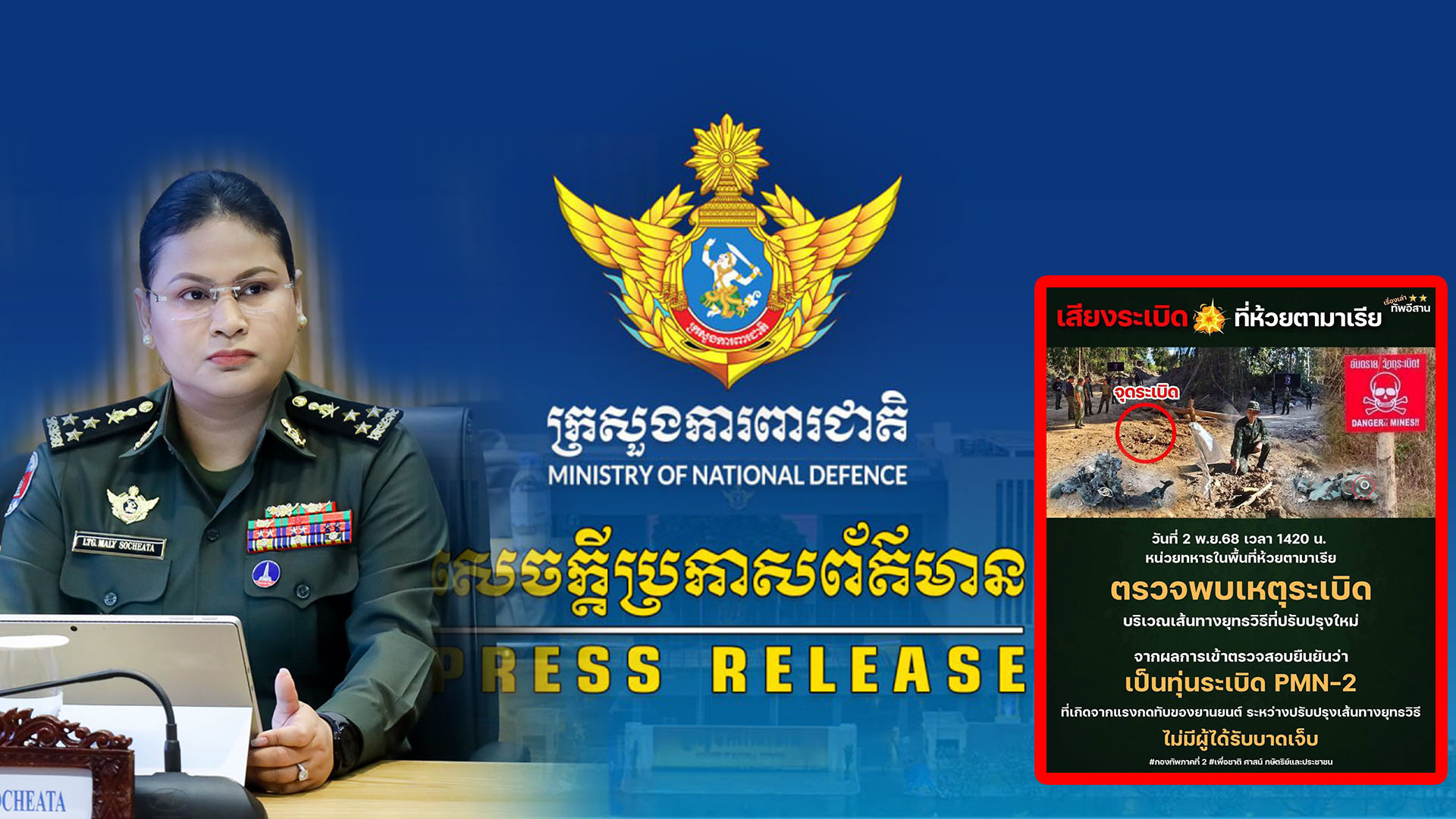 ក្រសួងការពារជាតិ បានឱ្យដឹងថា បើយោងតាមព័ត៌មានដែលទទួលបានពីយោធភូមិភាគទី៤ របស់កម្ពុជា បានបញ្ជាក់ថា កាលពីថ្ងៃទី២ ខែធ្នូ ឆ្នាំ២០២៥ នៅវេលាម៉ោង ១៤:២០នាទីរសៀល គឺ “ពុំមានឮសម្លេងផ្ទុះគ្រាប់មីន ដូចការអះអាងរបស់កងទ័ពភូមិភាគទី២ថៃឡើយ”។