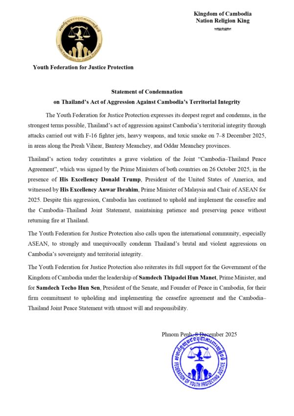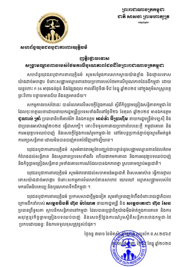 តាមរយៈបណ្តាញសង្គមយុវជនបូជាការពារយុត្តិធម៌ នៅយប់ថ្ងៃចន្ទ ទី៨ ខែធ្នូនេះ សហព័ន្ធយុវជនបូជាការពារយុត្តិធម៌ សូមថ្កោលទោសទង្វើរបស់ទាហានថៃ ដែលបានបាញ់ប្រហារលើប្រជាពលរដ្ឋកម្ពុជា យ៉ាងកំរោលជាច្រើនលើកច្រើនសារ៕