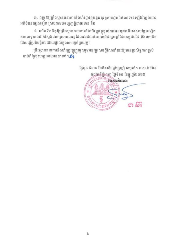 ធនាគារជាតិ បានណែនាំឱ្យគ្រឹះស្ថានធនាគារនិងហិរញ្ញវត្ថុ ត្រូវលើកលែងរាល់កម្រៃនិងការផាកពិន័យពាក់ព័ន្ធនឹងឥណទាន គិតចាប់ពីថ្ងៃនេះរហូតដល់ ថ្ងៃទី៣១ ខែឧសភា ឆ្នាំ២០២៦ ដល់អតិថិជនជាយោធិនដែលធ្វើប្រតិបត្តិការដោយផ្ទាល់ ក្នុងសមរភូមិប្រយុទ្ធ និងលើកលែងការទូទាត់សងការប្រាក់ និងពន្យារពេលទូទាត់សងប្រាក់ដើម គិតចាប់ពីថ្ងៃនេះ រហូតដល់ថ្ងៃទី៣១ ខែឧសភា ឆ្នាំ២០២៦ ដល់អតិថិជនជាយោធិនដែលធ្វើប្រតិបត្តិការ ដោយផ្ទាល់ក្នុងសមរភូមិប្រយុទ្ធ។ ចំពោះការអនុគ្រោះនេះ គ្រឹះស្ថានធនាគារនិងហិរញ្ញវត្ថុ មិនត្រូវធ្វើមូលធនកម្មការប្រាក់លើប្រាក់ដើមនោះទ