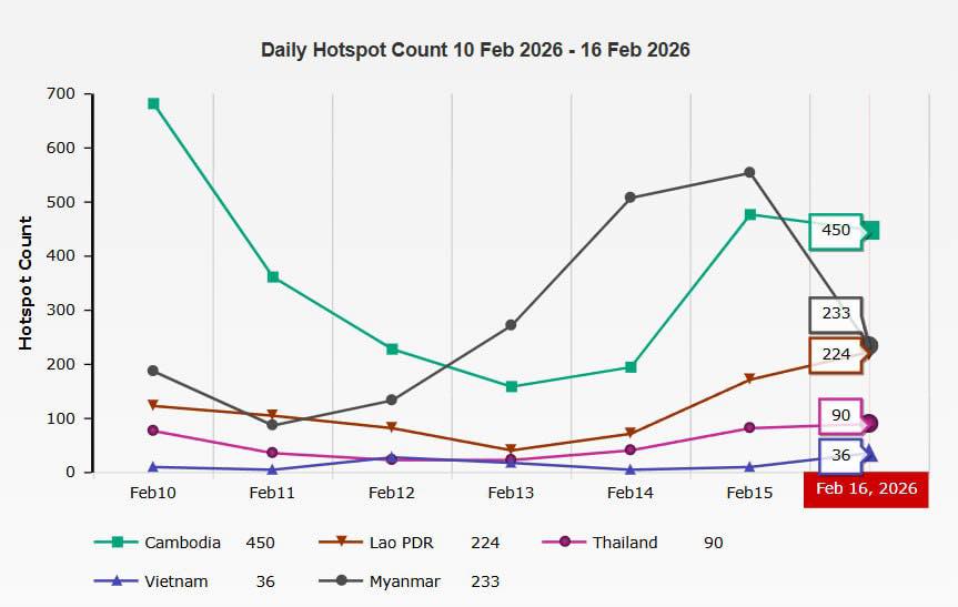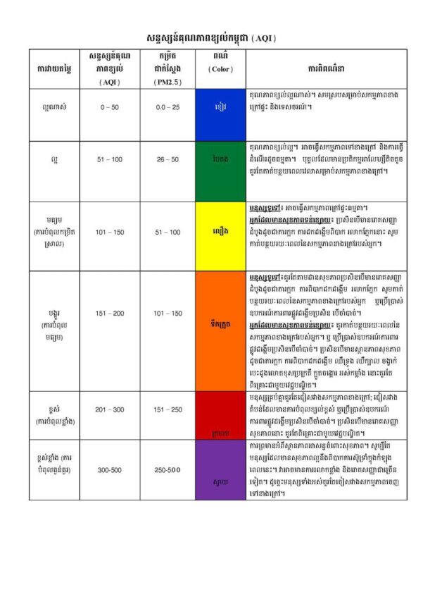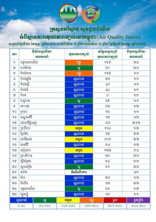 ទន្ទឹមនឹងនេះ ក្រសួងបរិស្ថាន បានបញ្ជាក់ថា ស្ថានភាពគុណភាពខ្យល់នៅកម្ពុជា គិតចាប់ពីម៉ោង ៧ ព្រឹក ថ្ងៃទី១៦ ខែកុម្ភៈ ឆ្នាំ២០២៦ ដល់ម៉ោង ៧ ព្រឹក ថ្ងៃទី១៧ ខែកុម្ភៈ ឆ្នាំ២០២៦ ត្រូវបានពិនិត្យឃើញថា កំហាប់ភាគល្អិតនិចល គិតជាមធ្យមស្មើនឹង ៣៣.៣៧ µg/m3 ធៀបនឹងស្តង់ដារ ៥០ µg/m3 និងគិតជាសន្ទស្សន៍គុណភាពខ្យល់ (Air Quality Index) គឺ “ល្អ”។